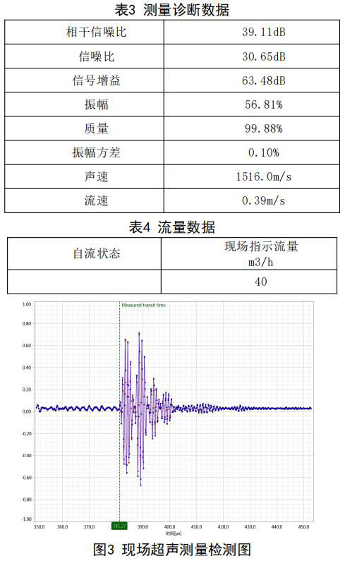 在機(jī)組自流補(bǔ)給水狀態(tài):同樣采用德國(guó)FLUEX 高精度外夾式超聲波流量計(jì)作為標(biāo)準(zhǔn)流量計(jì),測(cè)量 基礎(chǔ)數(shù)據(jù):管道外徑276.93mm,管壁厚度12.40mm, 采用兩聲程169mm傳感器安裝距離,通過對(duì)超聲波流量計(jì)信號(hào)分析與診斷(數(shù)據(jù)見表3和表4),超聲 波流量計(jì)測(cè)量狀態(tài)符合條件,開始測(cè)量,打開凝汽 器入口閥門,流量測(cè)量情況如下
