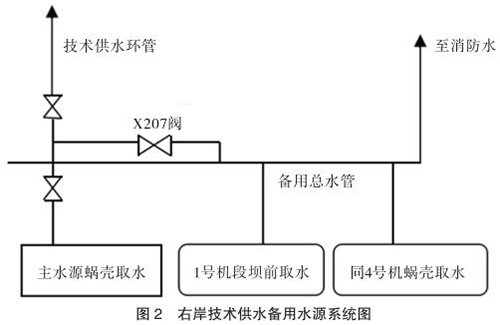 技術(shù)供水系統(tǒng)設(shè)有主、備用水源。主水源是蝸殼取水,作為機(jī)組技術(shù)供水的主用水源。備用水源有兩個,一個是設(shè)在 1 號機(jī)段的壩前取水,取水口高程為 145m,另一個是同 4 號機(jī)組蝸殼取水共用取水口的蝸殼備用取水。兩路備用水源均接到備用總水管,并通過 X207 閥分別與各臺機(jī)組的技術(shù)供水系統(tǒng)相連通(見圖 2)。