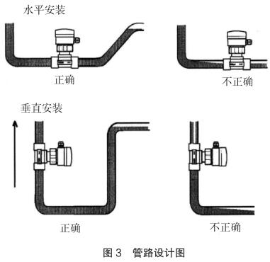 現(xiàn)場安裝時應(yīng)注意遠(yuǎn)離可能對其產(chǎn)生干擾的大型設(shè)備,防止長期的熱輻射和其他如磁場直射等環(huán)境影響。為確保高測量精度和較好的零點(diǎn)穩(wěn)定性,進(jìn)行校正前,智能型電磁流量計(jì)應(yīng)裝入工藝介質(zhì)中至少 24 小時電極鈍化。安裝的管路設(shè)計(jì)應(yīng)確保管道始終充滿流體,防止測量誤差,管路設(shè)計(jì)圖見圖 3。