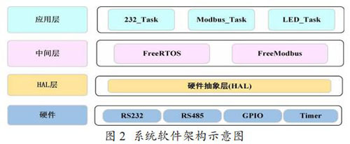 Modbus 通訊模塊的軟件架構(gòu)如圖 2 所示,分為硬件層、硬件抽象層,中間層和應(yīng)用層。中間層包括一個實(shí)時操作系統(tǒng)FreeRTOS 和一個針對嵌入式環(huán)境開發(fā)的輕量級 Modbus 協(xié)議庫Freemodbus。在應(yīng)用層,主要創(chuàng)建了三個任務(wù),232_Task 負(fù)責(zé)讀 取和解析流量計表頭輸出的文本信息,Modbus_Task 負(fù)責(zé)存儲 解析后的流量計數(shù)據(jù)到 Modbus 寄存器表,以及以 Modbus 協(xié)議與取水監(jiān)測設(shè)備通信,LED_Task 是一個輔助任務(wù),主要用來提示程序運(yùn)行狀態(tài)。