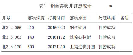 表1為氣體轉(zhuǎn)子流量計(jì)打撈統(tǒng)計(jì)表,可以看出自2016年9月開(kāi)始即在現(xiàn)場(chǎng)進(jìn)行了應(yīng)用。為了展示試驗(yàn)成果的普遍性,分別從不同注入方式、不同落物深度、不同落物原因的角度,共應(yīng)用3口鋼絲落物井,打撈成功為100%。